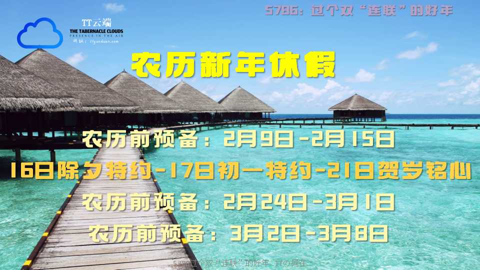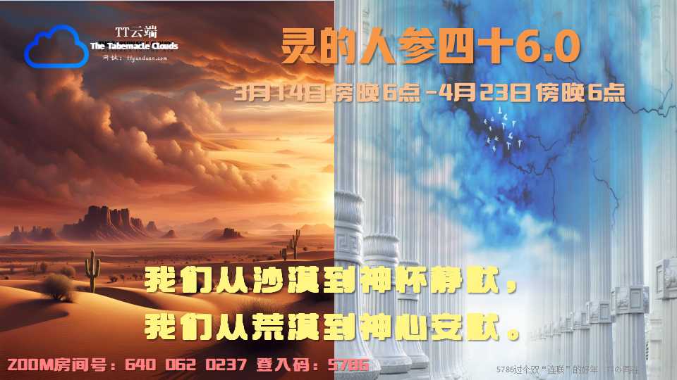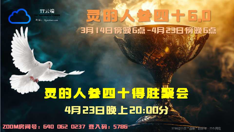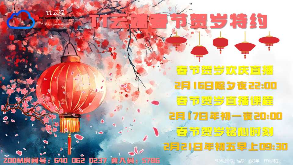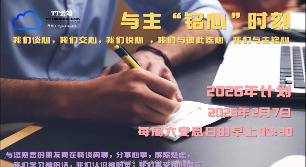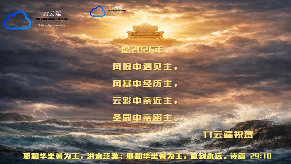0.MainTT云端主页TTCloud.TT云端 PRESENCE IN THE AIR 神的同在,在空中 愿2026年, 风浪中遇见主, 风暴中经历主, 云彩中亲近主, 圣殿中亲密主。耶和华坐着为王,洪水泛滥;耶和华坐着为王,直到永远。诗篇 29:10 TT云端祝贺 愿5786连接连臂连行连贯连结临到你 愿2026联谊联钉联席联合联络成全你 过个双“连联”的好年!TT云端祝贺 TT云端来临精彩聚会 回顾上周直播课程 点击海报进入各系列页面——————————————————————————————————————————————到站访次 0 关注我们的频道 Rhema神的话 - 我们の课程点击海报进入各系列页面 5786.2026系列- TT云端秋季贺岁特约- TT云端2026跨年特约- TT云端春节贺岁特约 Makarios启示录 (启 1:3 [Cuv/S]) 念这书上预言的和那些听见又遵守 其中所记载的,都是有福的,因为日期近了。 5785.2025系列- TT云端秋季贺岁特约- TT云端2025跨年特约- TT云端春节贺岁特约 战胜哈曼系列- 胜过哈曼的众子- 胜过哈曼的朋友- 我们一起操练胜过(蓝房、铭心) 5784.2024系列- TT云端犹太新年特约- TT云端2024跨年特约- TT云端春节贺岁特约 我的圣灵系列 5783.2023系列- TT云端犹太新年特约- TT云端2023跨年特约- TT云端春节贺岁特约 眼泪系列 属灵真相与当代世界 5782.2022系列 TT云端春节贺岁特约 TT云端跨年特约 神的代祷者系列 精英讲座系列 泥土系列 灵的成长系列点击海报进入各系列页面 Pnuema神的灵-我们の敬祷 与主“铭心”时刻我们谈心,我们交心,我们说心 ,我们与彼此连心,我们与主铭心 蓝房300TT云端祷告歌唱敬拜房间 (士 7:7 [Cuv/S]) 耶和华对基甸说:我要用这餂水的三百人拯救你们.... 我们の敬拜祷告网聚会系列 FLOW OF HOLY SPIRIT 圣灵的流 灵的人参 40 5.0(5785-2025)---灵的人参40 3.0(5783-2023)我们约好了一起每年禁食四十天 TCréative创作+-我们の创作T Créative创作+先知性绘画 先知性绘画-赛 4.23 先知性绘画-诗 66.12 T Créative创作+新歌 我们的联系 我们谈心,我们交心,我们说心 Email 邮件:[email protected] Enigma 隐匿码:ttyunduan 联系我们请在浏览器中启用JavaScript来完成此表单。Name 姓名 *Email 邮件 *Testimony or Prayer Request 见证分享与代祷需要 *Send Message 发送 回到主页