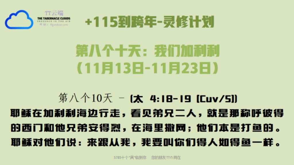 +115到跨年-灵修计划 – 第八个十天:我们加利利(11月13日傍晚-11月23日) 发表评论 / 115Plan / ttliangshan – 第一天 – 11月13日晚6点-14日 第二天 – 11月15日 第三 […] +115到跨年-灵修计划 – 第八个十天:我们加利利(11月13日傍晚-11月23日) Read More »
